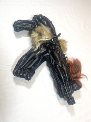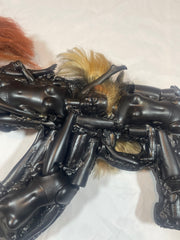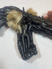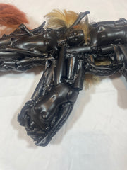 Un Sombre Draco, composé de poupées, surgit de la nuit. Pièce unique assemblée par Svhaine Alvarez.