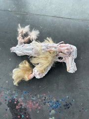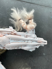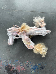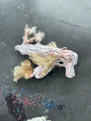 Assemblage sculptural réalisé à partir de figurines de poupées et de matériaux composites.